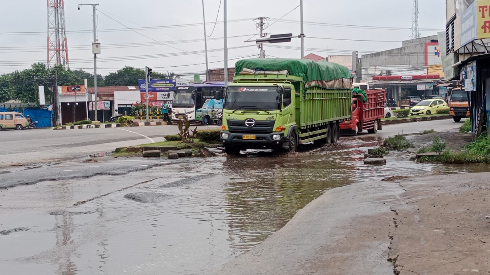 Selain persoalan drainase, kerusakan jalan juga memperparah kondisi. Jalur tersebut merupakan lintasan kendaraan berat seperti truk bermuatan besar, yang menyebabkan permukaan aspal banyak terkelupas dan berlubang.