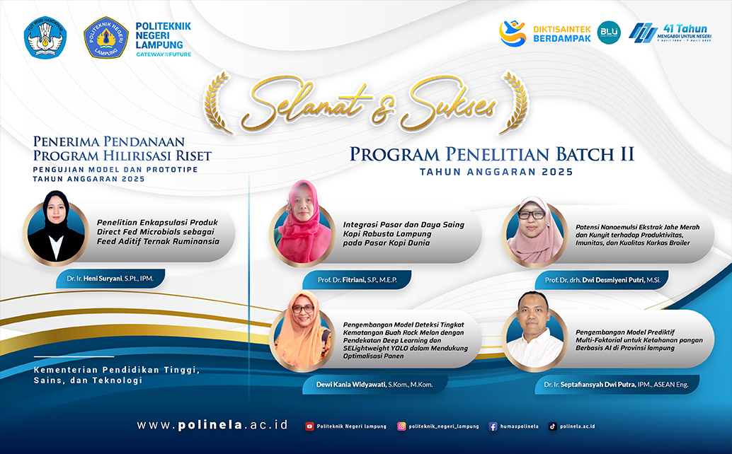 Politeknik Negeri Lampung (Polinela) kembali menorehkan prestasi membanggakan di tingkat nasional melalui keberhasilan lima dosennya yang lolos sebagai penerima pendanaan riset Tahun Anggaran 2025.Program ini merupakan bagian dari upaya pemerintah dalam memperkuat hilirisasi hasil penelitian dan pengembangan prototipe yang aplikatif dan berdampak nyata bagi masyarakat.